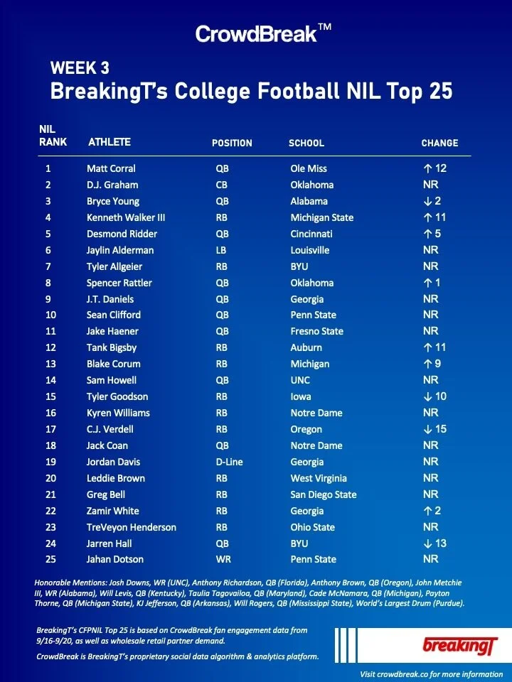 BreakingT’s College Football Player NIL Top 25 is based on CrowdBreak fan engagement data from 9/9 – 9/13, as well as retail partner demand.